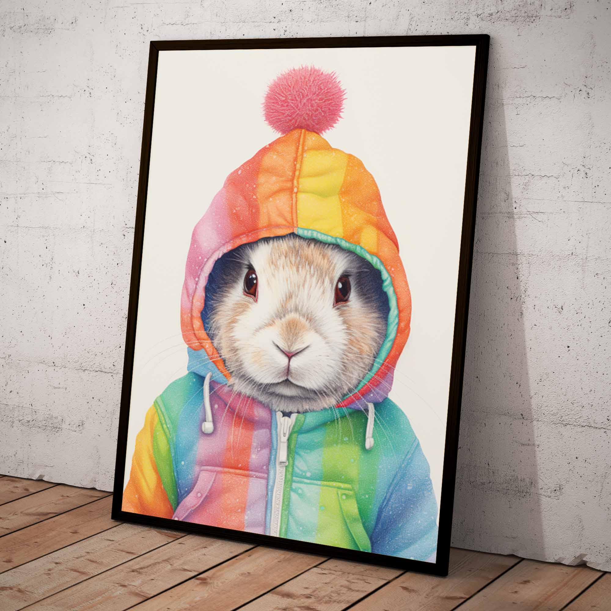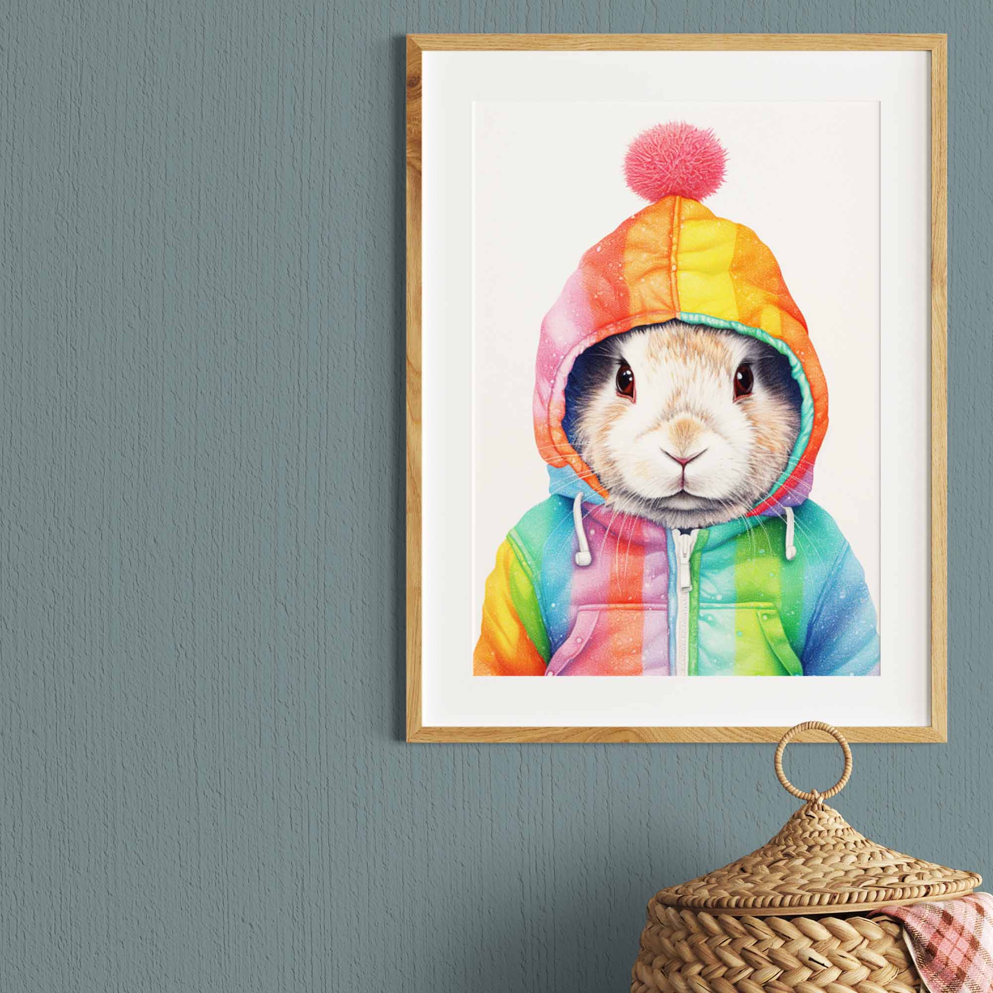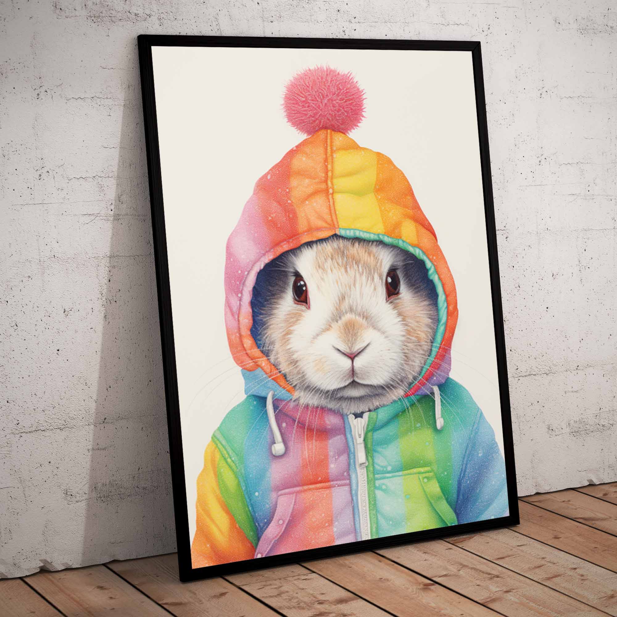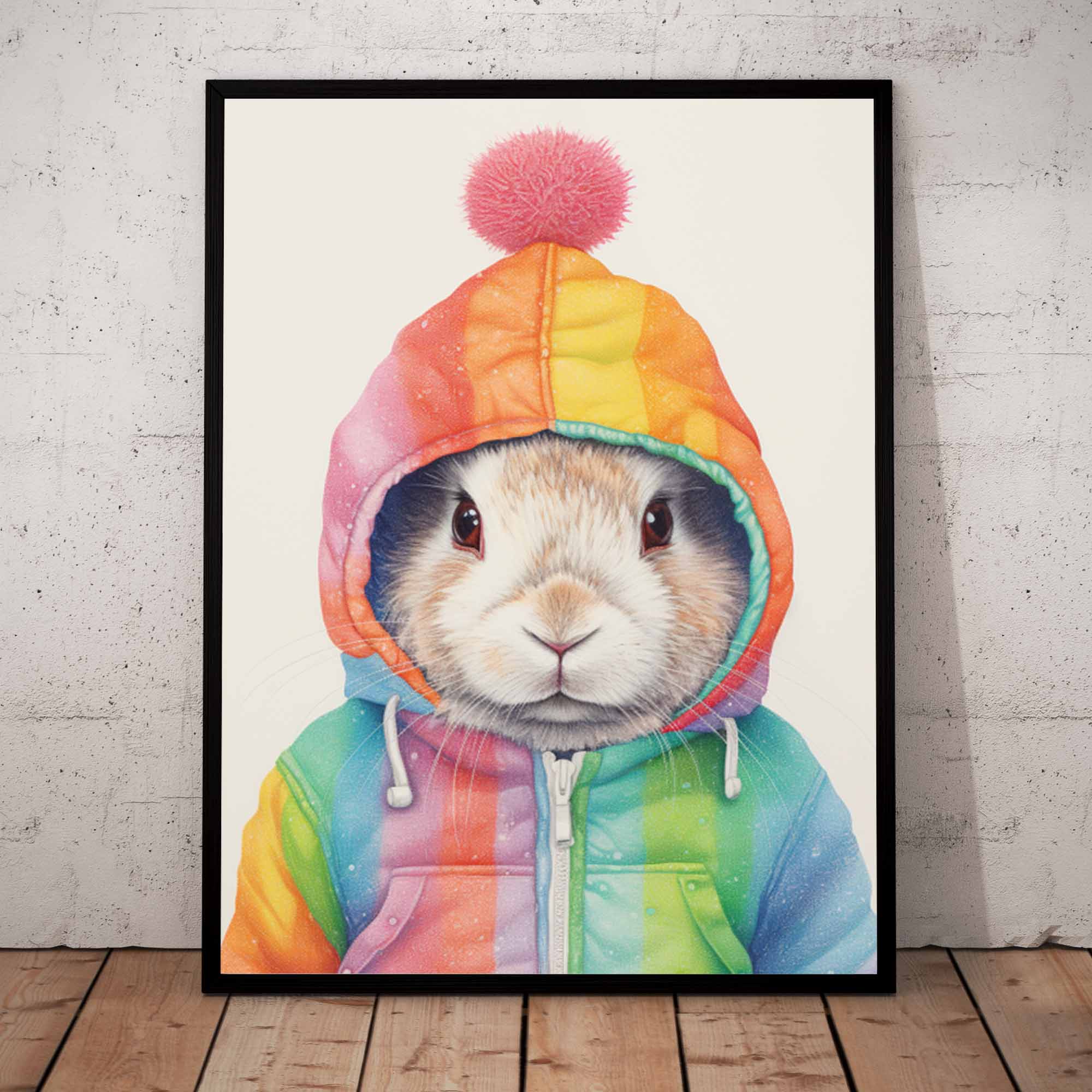 En kold kanin præsenteret på en stilfuld og kreativ måde. Skabt med håndmalede penselstrøg, scannet ind og bearbejdet i Photoshop med min egen lav-praktiske tilgang. Kombinationen af traditionelt håndværk og moderne teknik giver plakaten et unikt, personligt og iøjnefaldende udtryk, der tilføjer kant og kreativitet til ethvert rum.