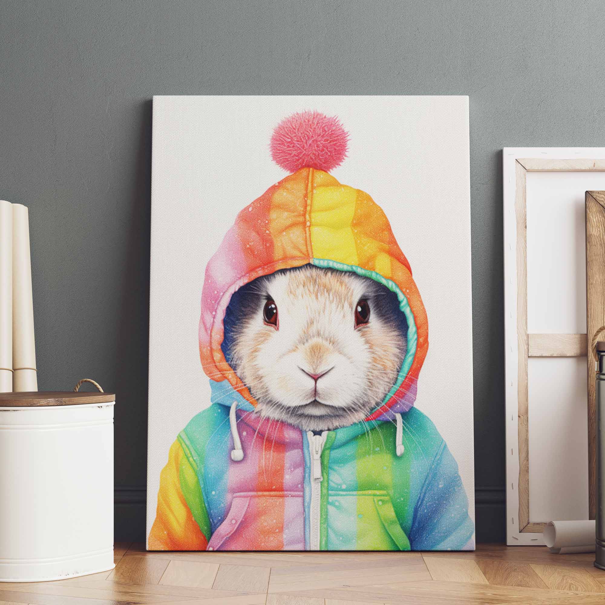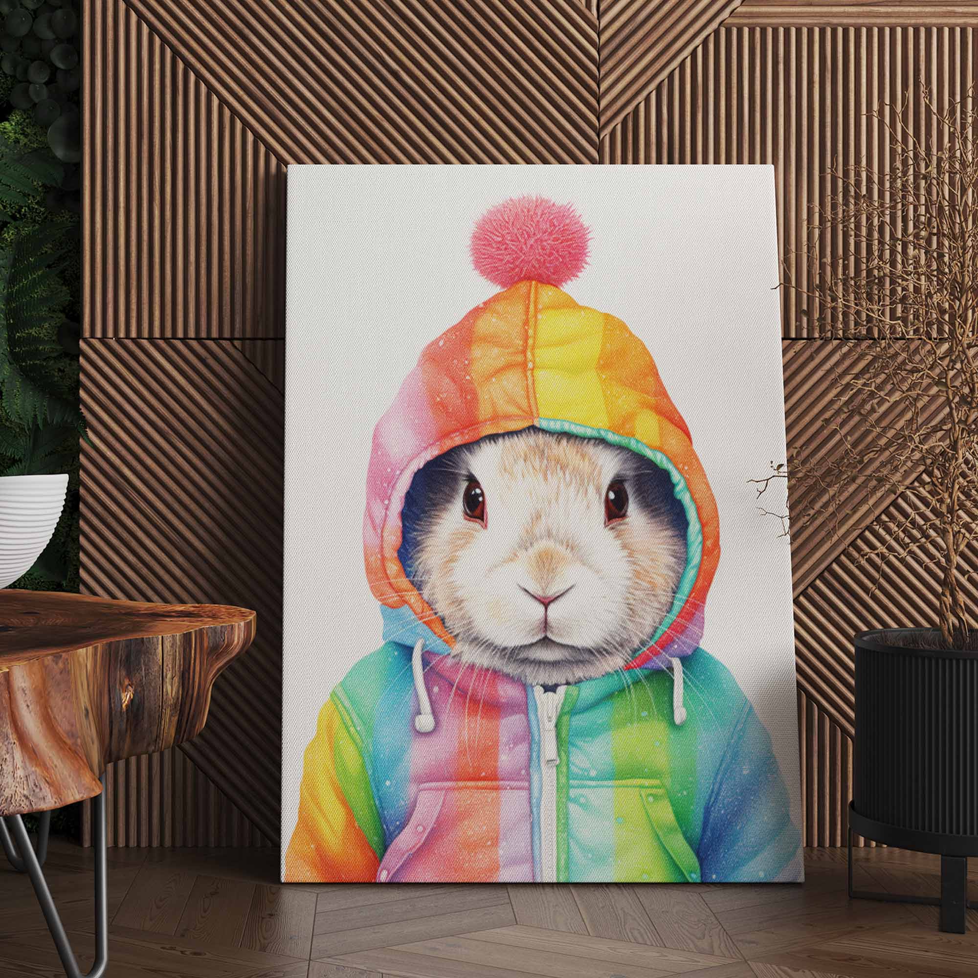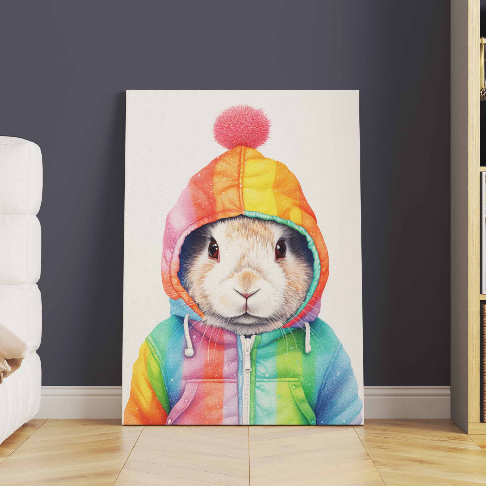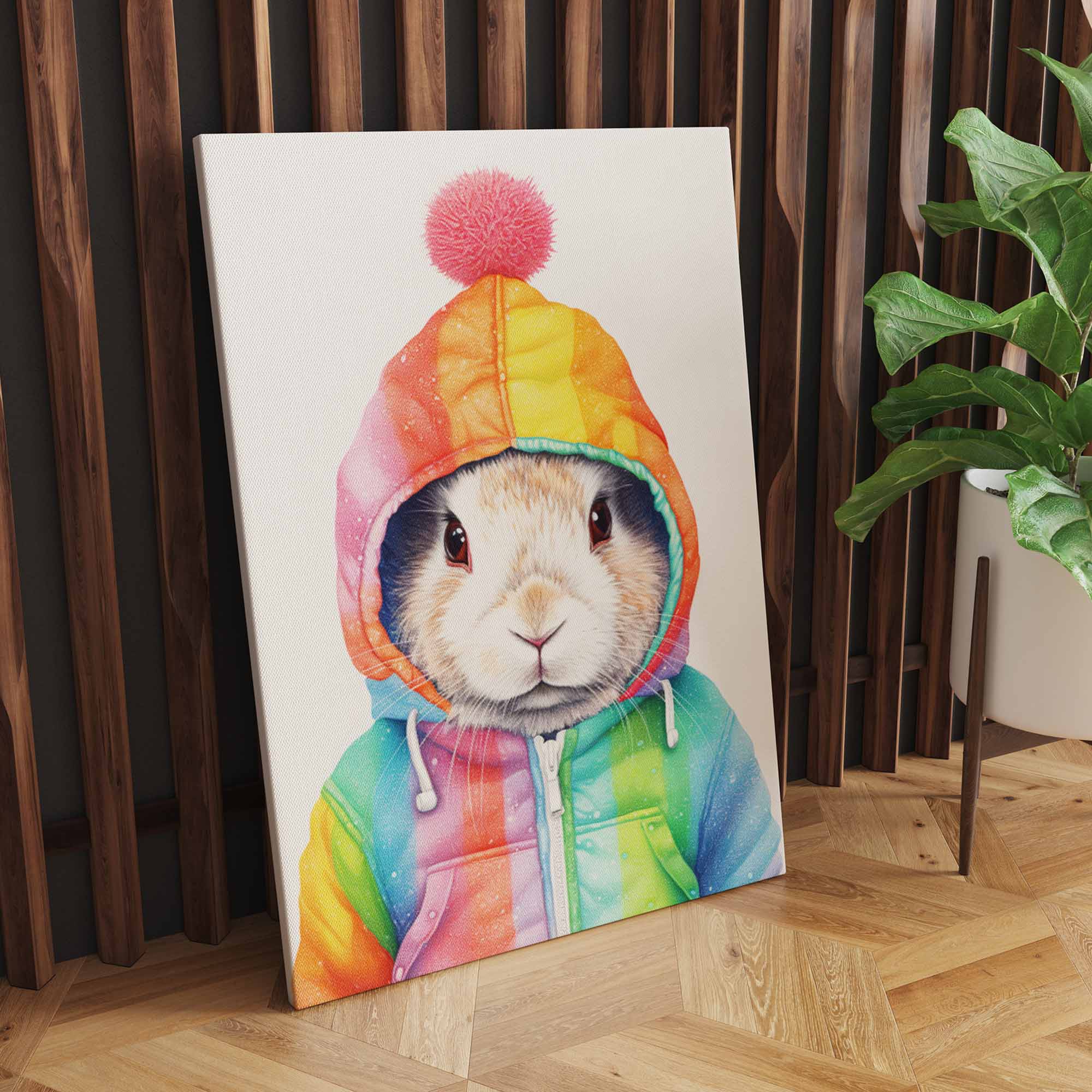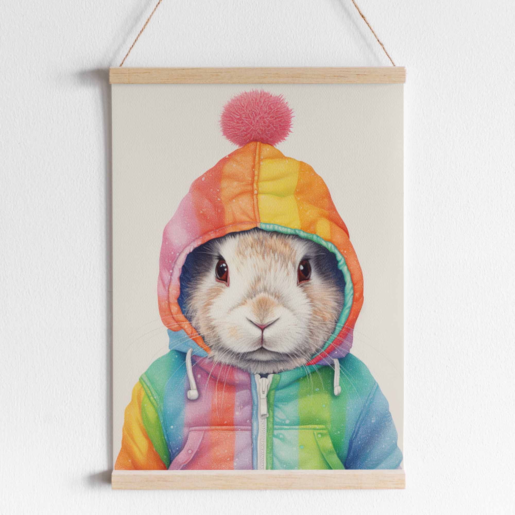 En kold kanin præsenteret på en stilfuld og kreativ måde. Skabt med håndmalede penselstrøg, scannet ind og bearbejdet i Photoshop med min egen lav-praktiske tilgang. Kombinationen af traditionelt håndværk og moderne teknik giver plakaten et unikt, personligt og iøjnefaldende udtryk, der tilføjer kant og kreativitet til ethvert rum.