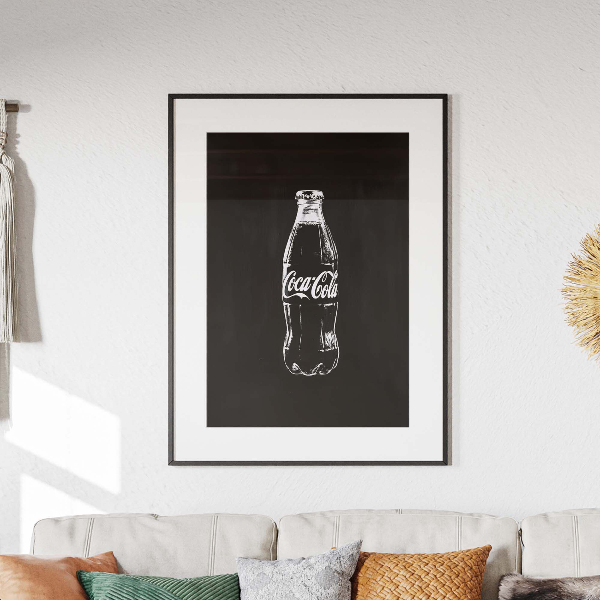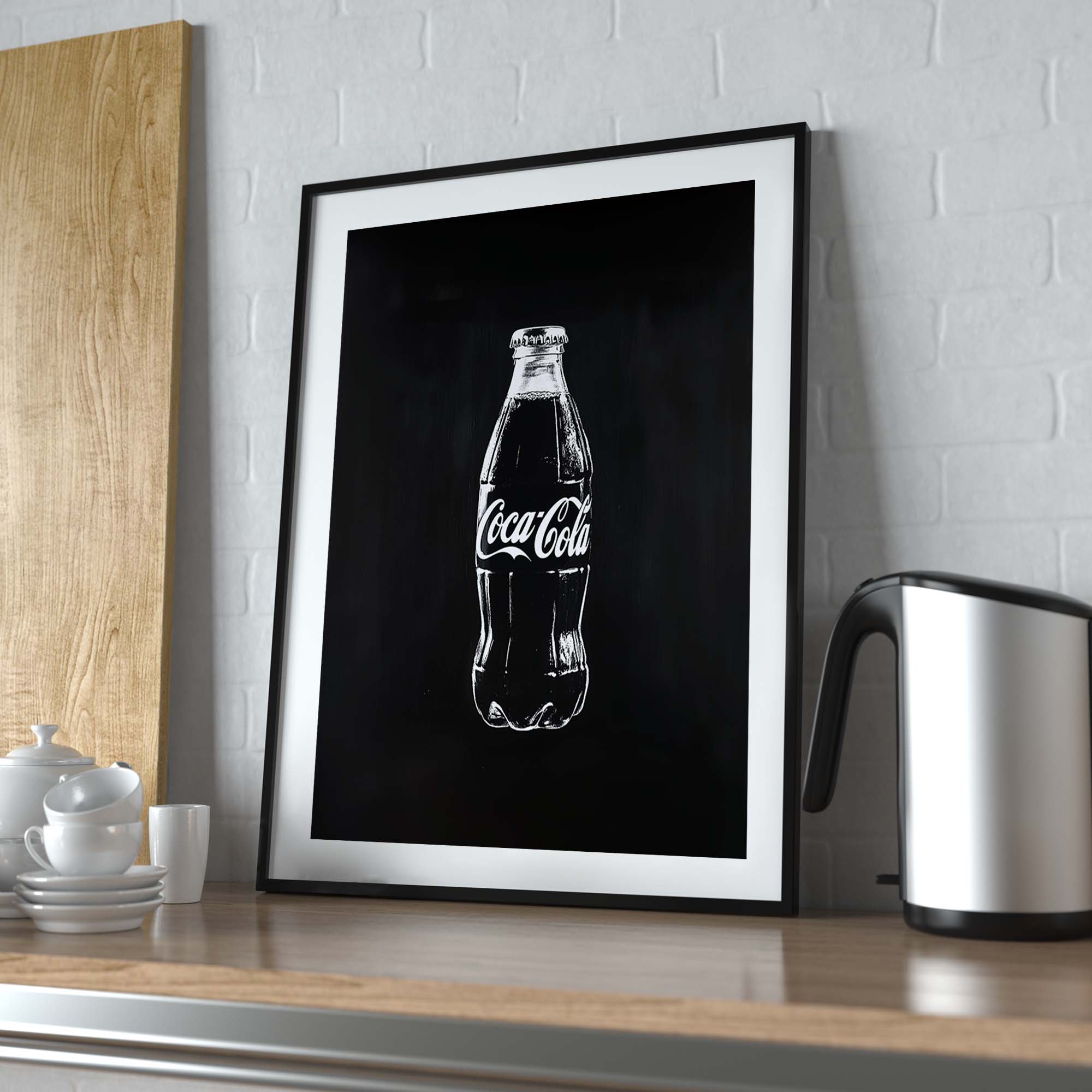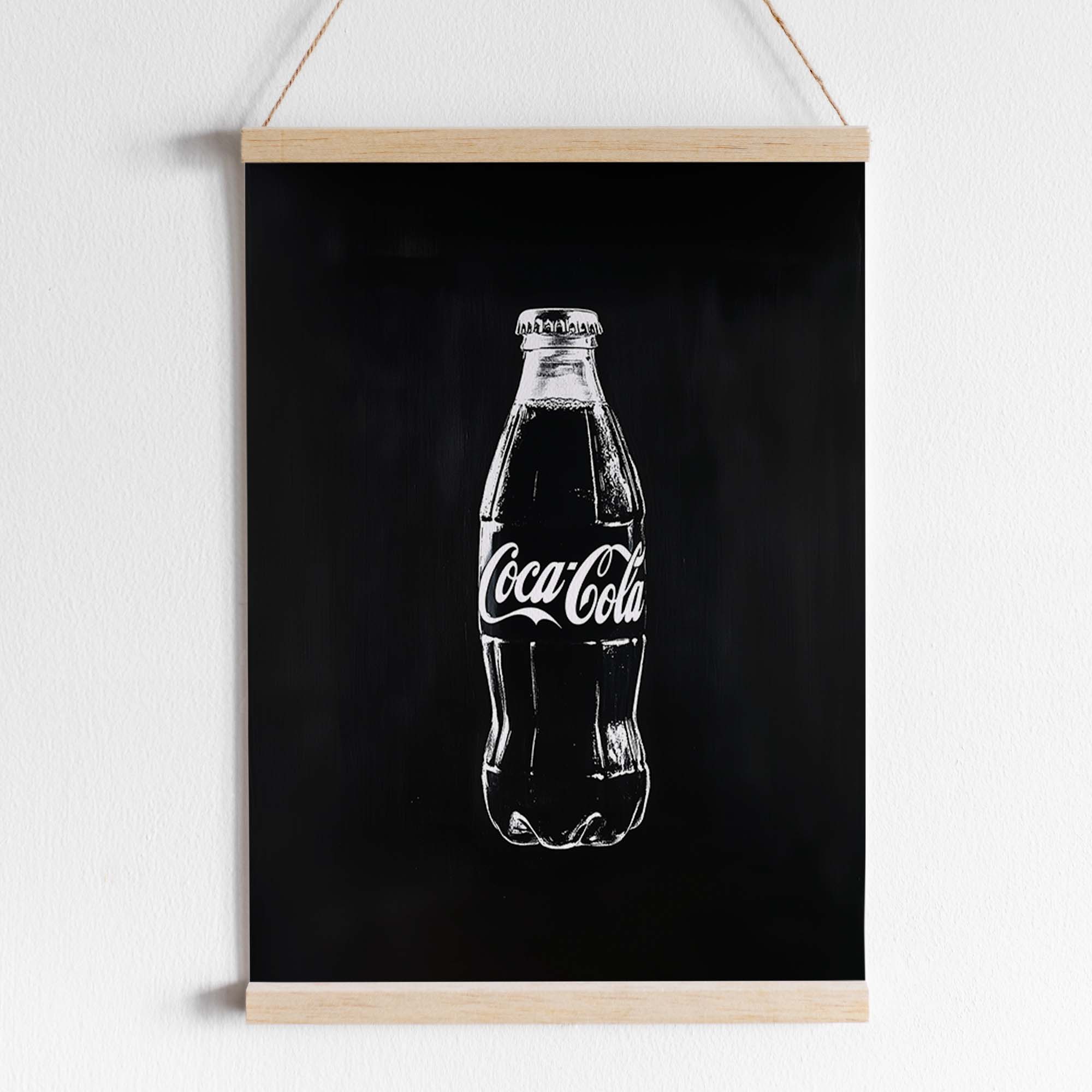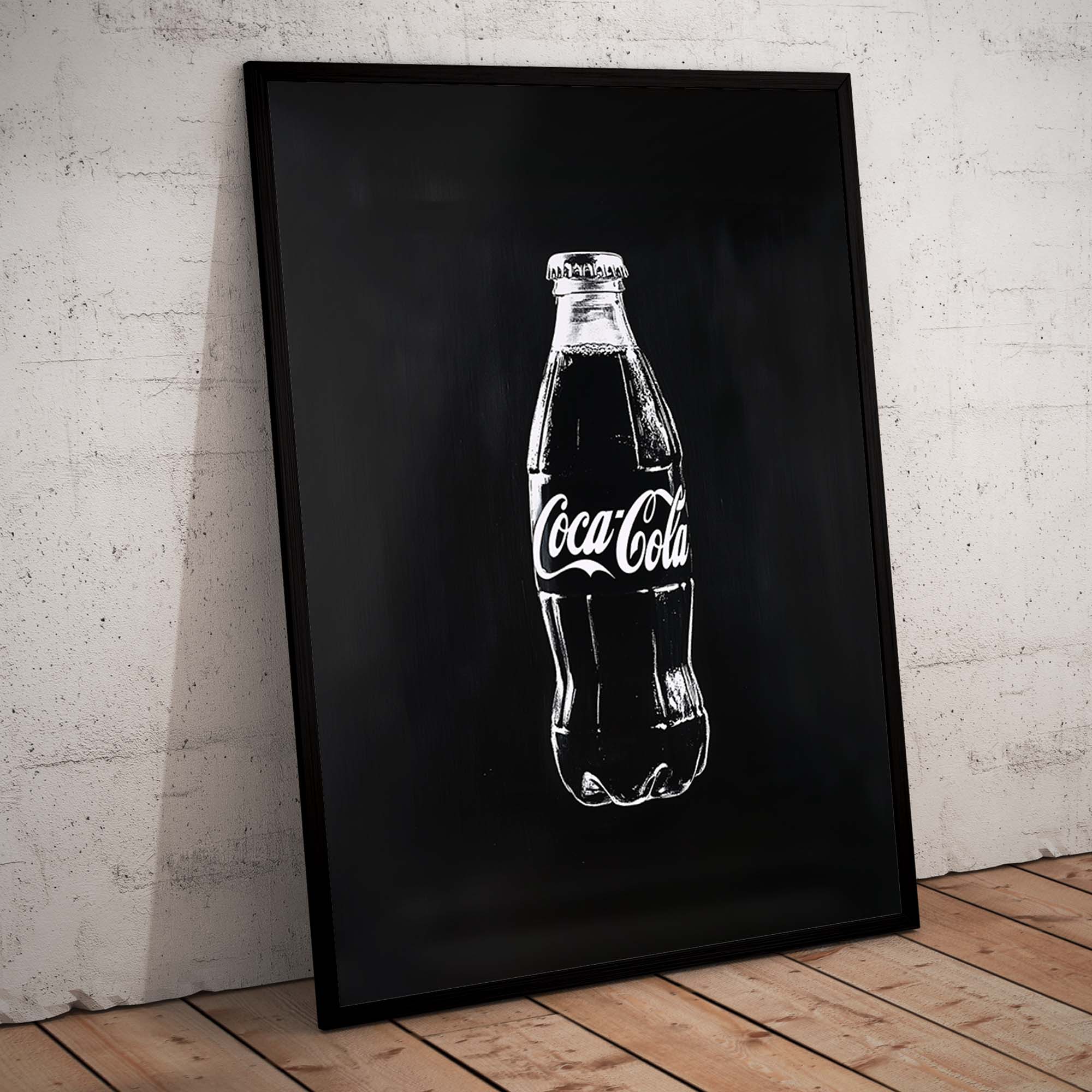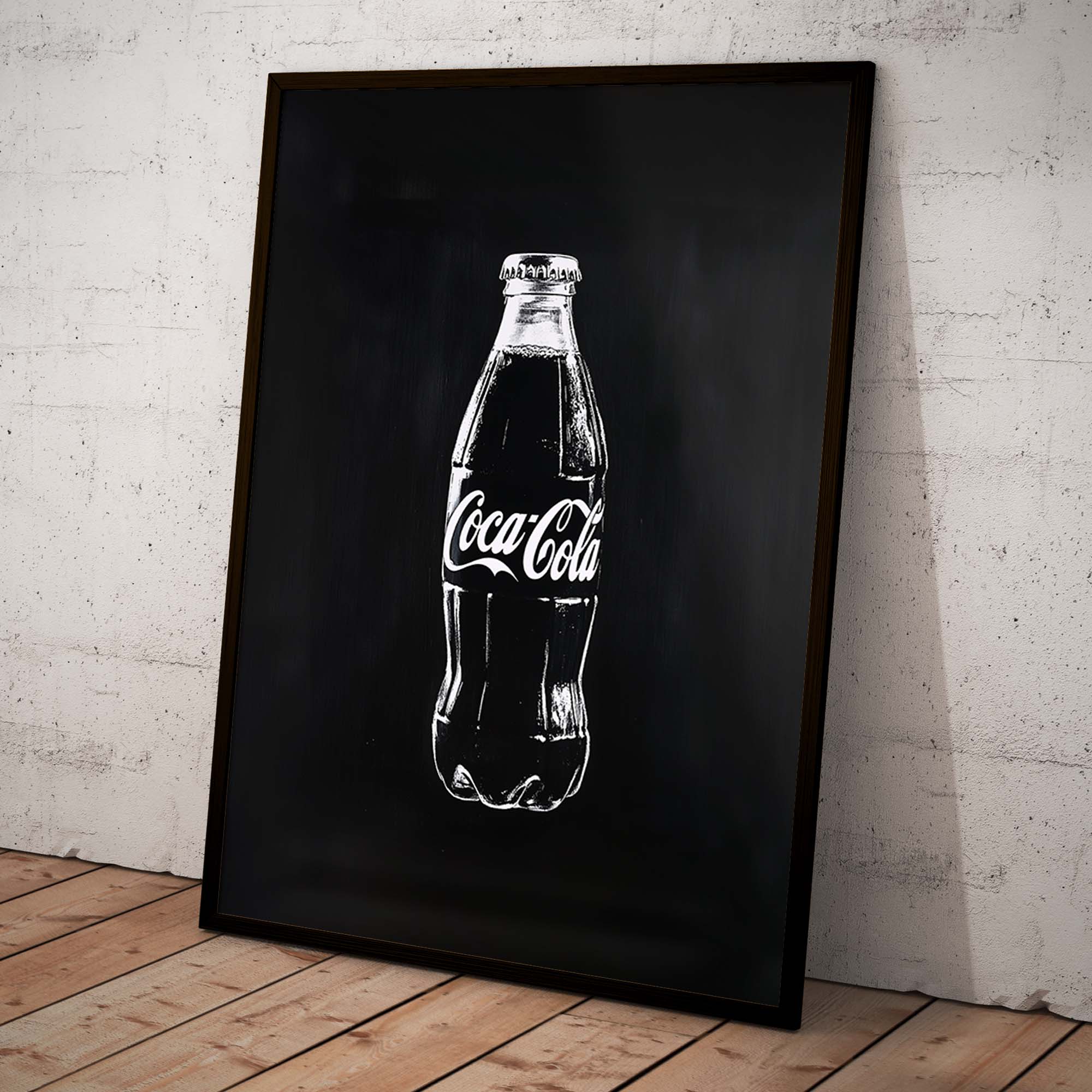 Denne plakat præsenterer en Coca-Cola flaske malet direkte på en metalplade, kradset ind i pladen for et råt og autentisk udtryk. Skabt med en kombination af håndmalede penselstrøg, scannet ind, og efterbehandlet med Photoshop og AI, giver designet et unikt, grafisk og moderne twist på klassisk popkunst. Den rustikke, industrielle stil og de dristige kontraster gør plakaten til et statement, der skiller sig ud og tilføjer kant og energi til ethvert rum.