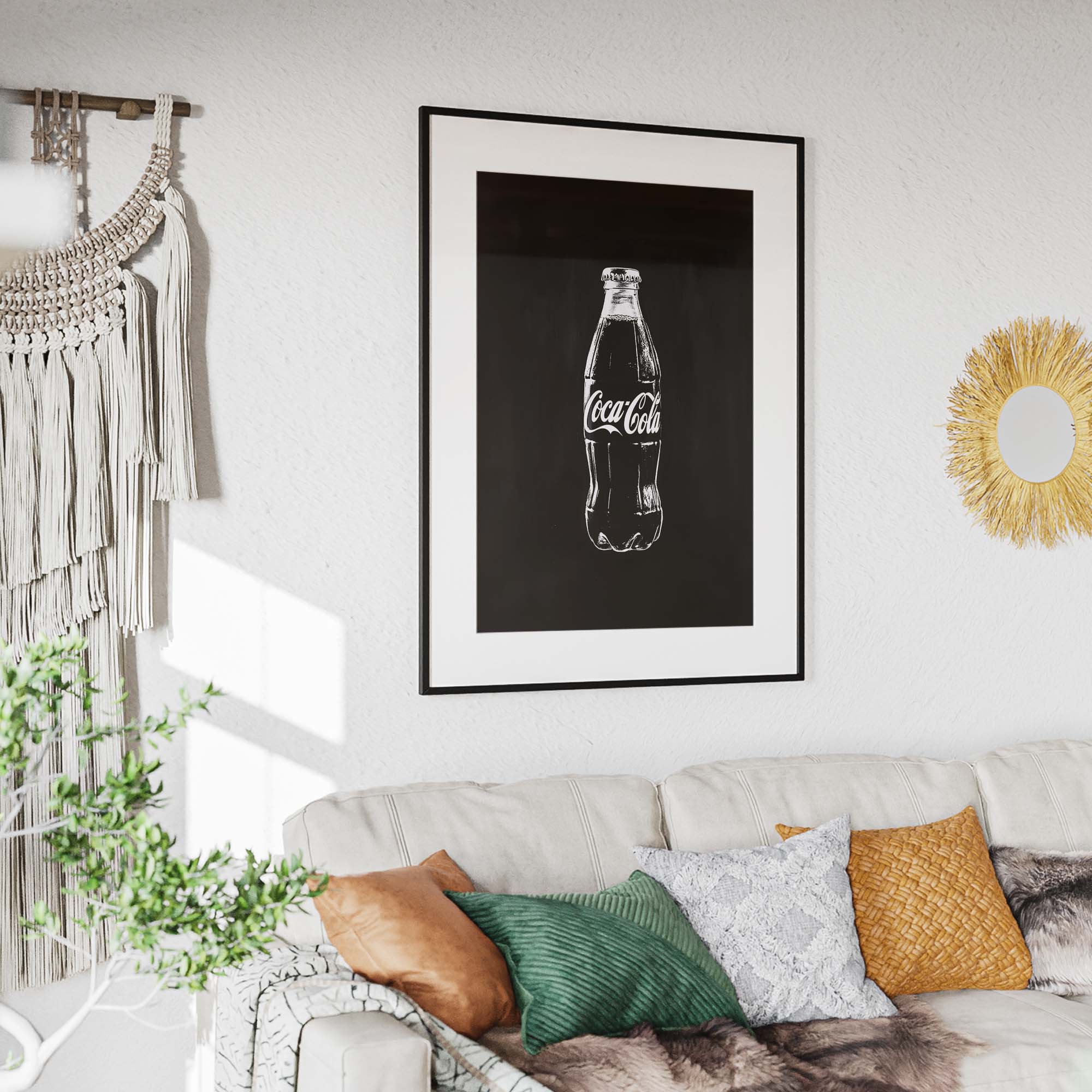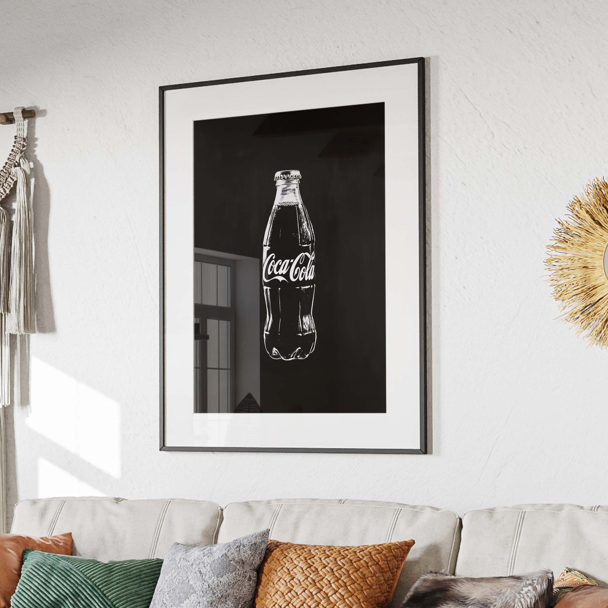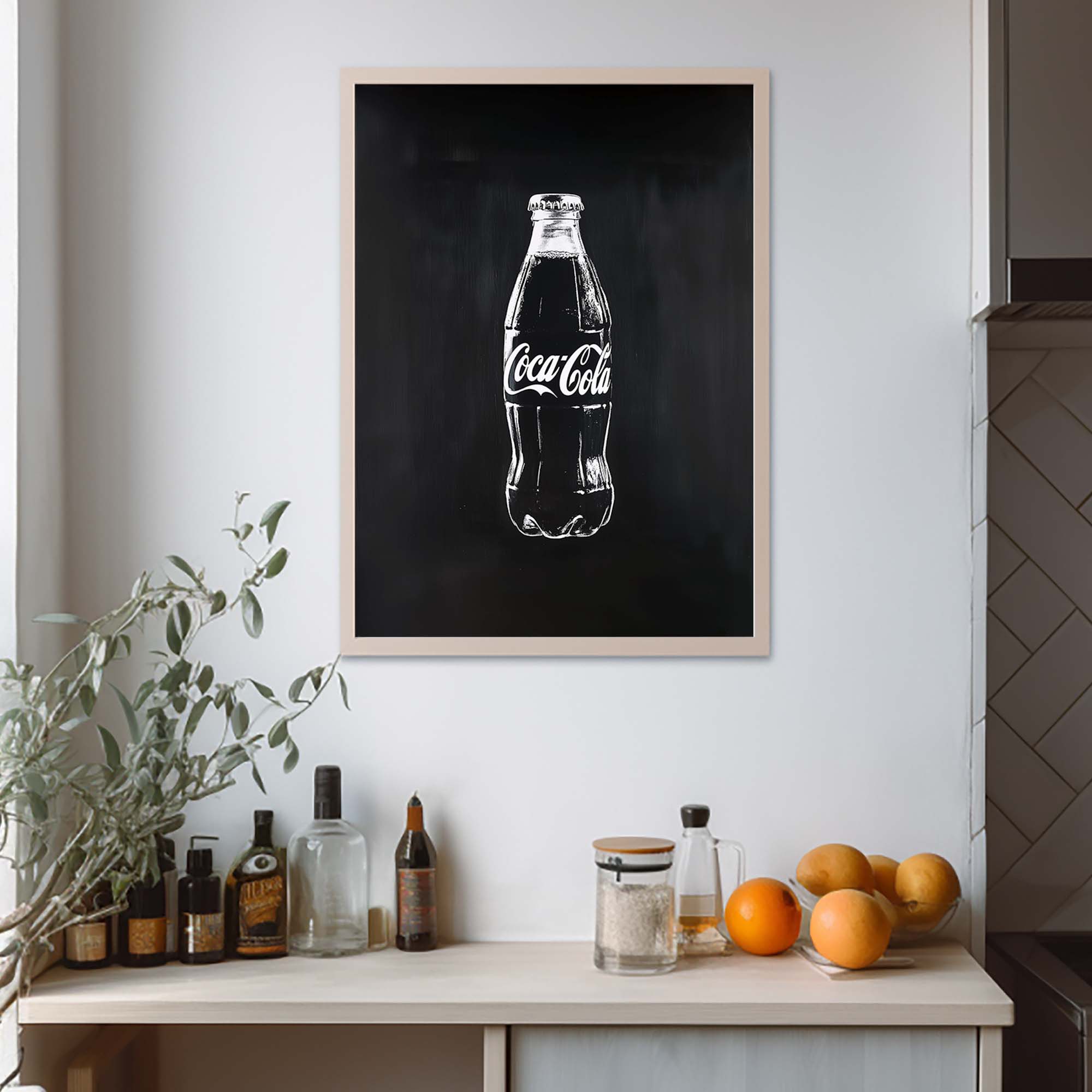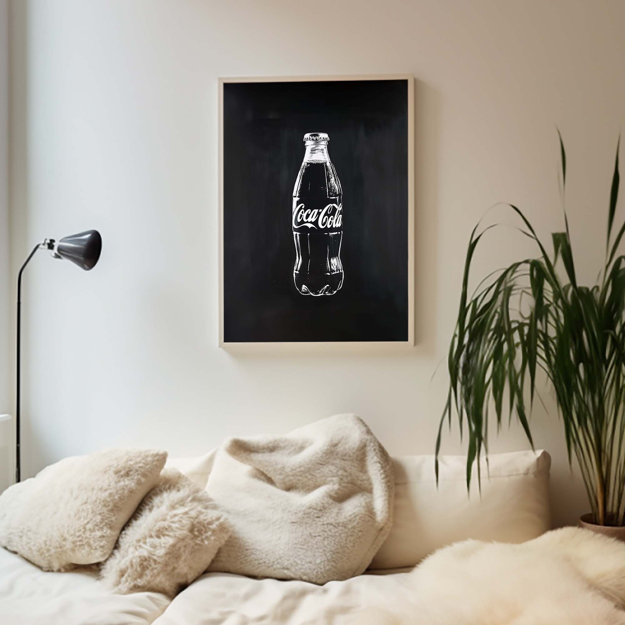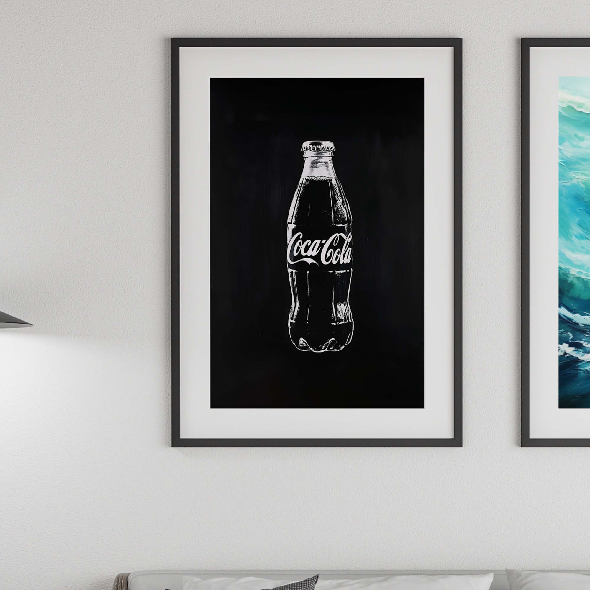 Denne plakat præsenterer en Coca-Cola flaske malet direkte på en metalplade, kradset ind i pladen for et råt og autentisk udtryk. Skabt med en kombination af håndmalede penselstrøg, scannet ind, og efterbehandlet med Photoshop og AI, giver designet et unikt, grafisk og moderne twist på klassisk popkunst. Den rustikke, industrielle stil og de dristige kontraster gør plakaten til et statement, der skiller sig ud og tilføjer kant og energi til ethvert rum.